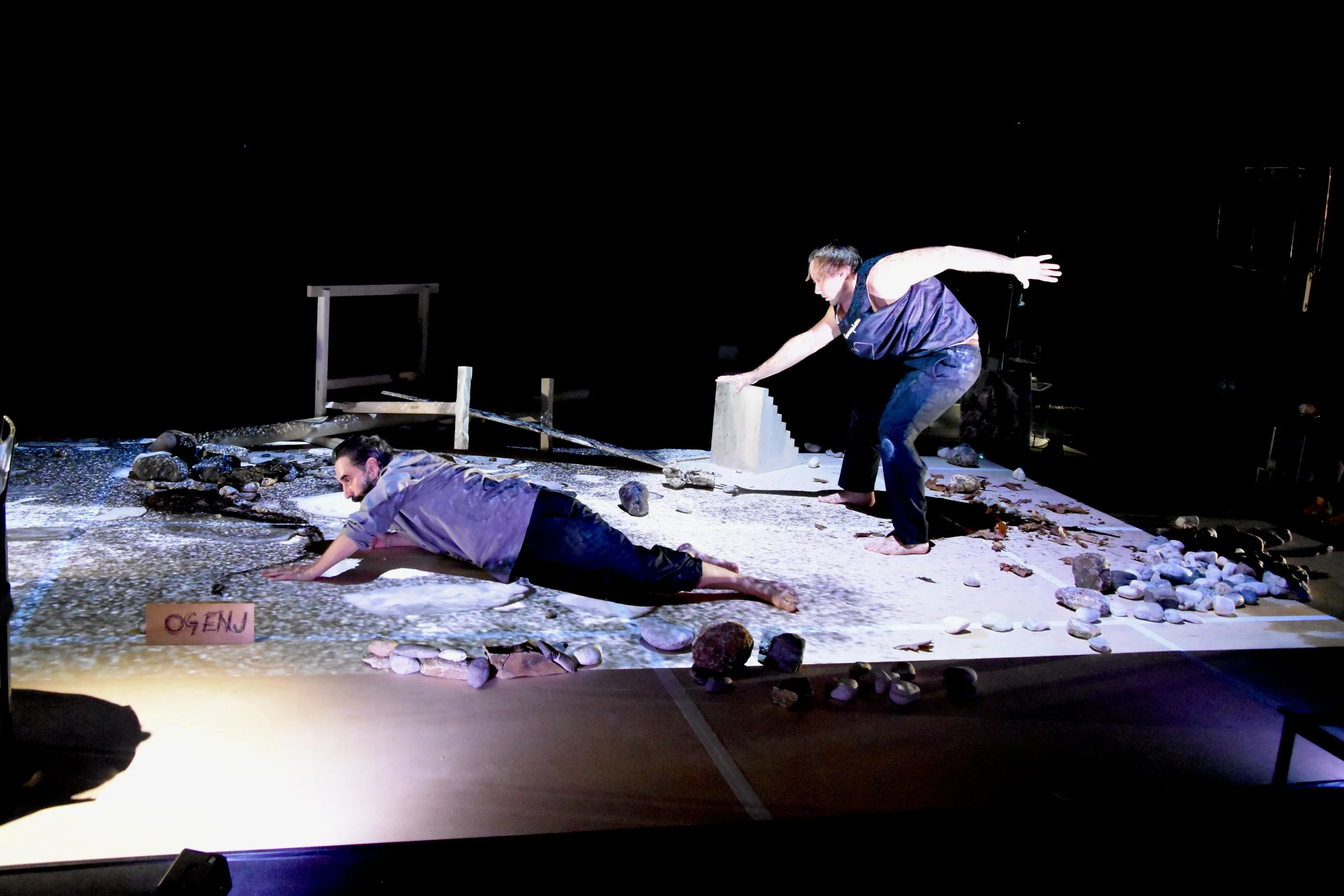 The performance is a hybrid of genres; it contains elements of postdramatic theatre, dance, object theatre, and installation, but the fundamental state of mind it tries to evoke is poetry. It establishes various registers, from the mythically sublime to the humorous. The words that meet the stones in this performance range from the re-creation of humans after the great flood, which Deucalion and Pyrrha achieve by throwing stones in Ovid's Metamorphoses, through Kafka's interpretation of the myth of Prometheus, to the poetry of Anton Aškerc, Jure Detela, and Miklavž Komelj. At the same time, it establishes a true palimpsest of intertextual connections; the final effect is linked to the description of the mysterious stone in Pier Paolo Pasolini's novel Petrolio: